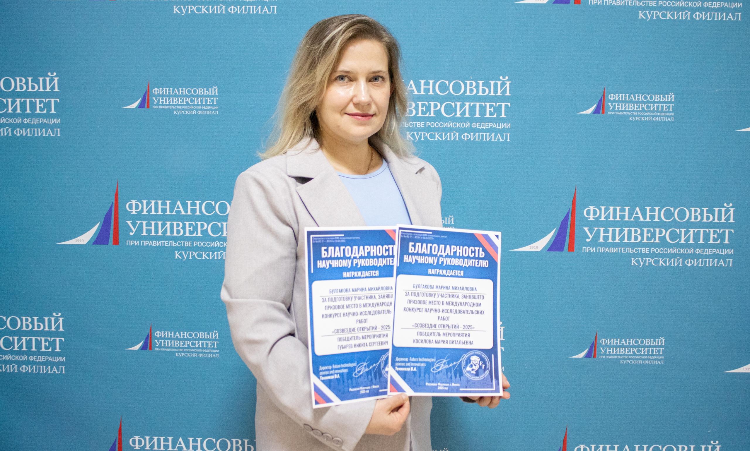 Студенты 2‑го курса направления подготовки «Экономическая безопасность» стали победителями Международного конкурса научно‑исследовательских работ «Созвездие открытий‑2025» под научным руководством к. э. н. Марины Михайловны Булгаковой.