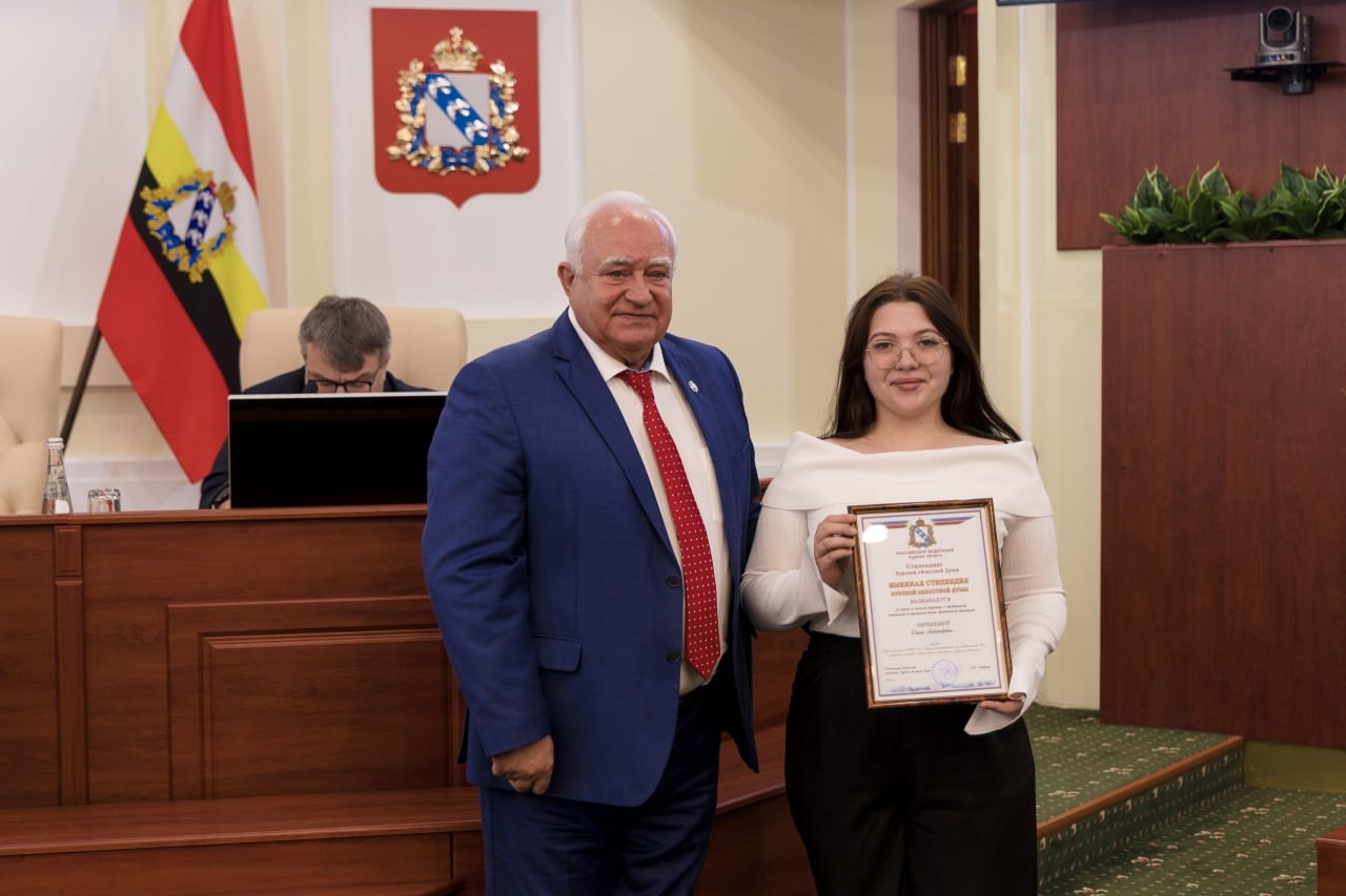 Поздравляем студентку Диану Перькову с назначением именной стипендии Курской областной Думы для студентов, обучающихся в образовательных организациях высшего образования Курской области, на 2025 - 2026 учебный год.