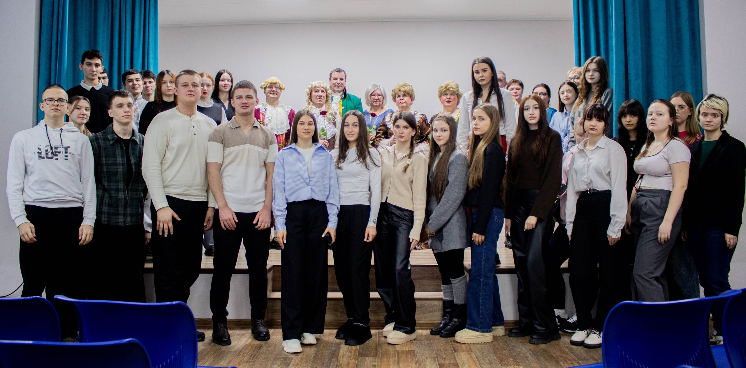 Перед нашими студентами выступил коллектив театральной студии «Данко» при Курской областной специальной библиотеке для слепых и слабовидящих им. В. С. Алехина. Артисты представили постановку по пьесе Григория Горина «Шут Балакирев» под руководством режиссёра-постановщика Нины Степановны Олешни.
